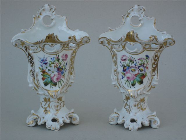 Paire de VASES en porcelaine. Décor peint de fleurs polychromes. Pied à volutes et col évasé, ajourés d'ornements rocaille, rehaussé d'or.