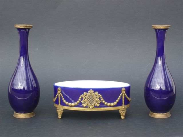 GARNITURE de cheminée en faïence glacurée "bleu de four" comprenant une jardinière quadripode et une paire de vases soliflores. Montures en bronze doré, médaillon à treillage entouré de lauriers et guirlandes de feuilles de chêne retenues par des gaines pour la jardinière, cerclage du talon et du col pour les vases. Marqués "SÈVRES".