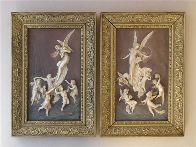 Deux plaques encadrées, formant pendants, en biscuit patinée. Enfants et anges musiciens en haut relief entourant une femme ailée. Signatures et marques en creux.