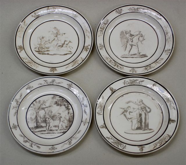 CHOISY - 4 ASSIETTES rondes à décor en grisaille : "Partage des trésors de Dagobert, Année 639, 20", "Rétablissement de l'Empereur d'Occident, Année 800, 21", "Charles le Simple rétabli sur le trône de ses pères, Année 892, 23", "Siège de Vienne par Louis et Carloman, Année 639, 24". Marque en creux P & H Choisy. Diam. 22cm.