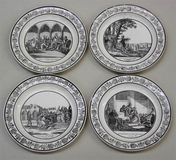 SEVRES- 4 ASSIETTES à décor imprimé en bistre, 3 représentant des scènes mythologiques et 1 Paul et Virginie. Bordures de trophées alternés de caducées . 2 marquées en creux "Sèvres", 2 marquées au cachet " A Sèvres par brevet d'invention". (usures).