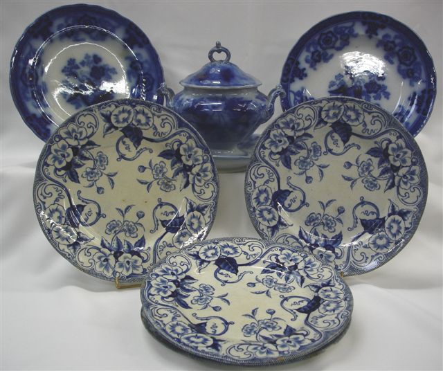 On y joint : une petite SOUPIÈRE couverte décor "Bryonia" et 2 ASSIETTES à décor en bleu marquées HERON-C.M.