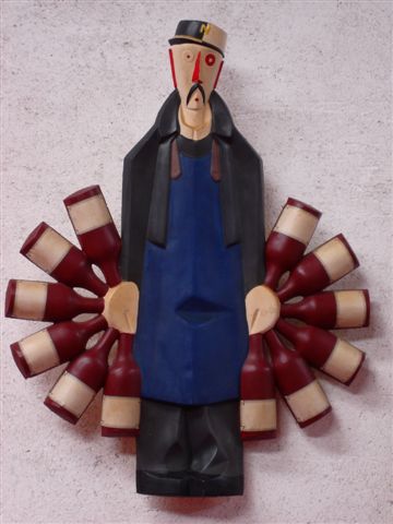 Grande représentation de NECTAR en plâtre polychrome, le visage stylisé en rouge, blanc et gris et le corps en bleu et gris, les bouteilles vertes. Nectar porte douze bouteilles en éventail où sont collées des étiquettes blanches, encadrées de fines lignes noires, en papier.
