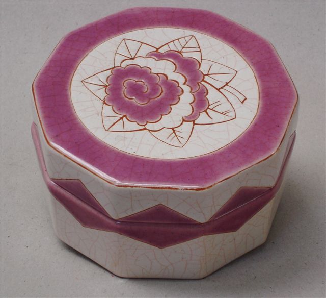 BONBONNIÈRE à 10 côtés. Décor d'une fleur rose sur réserve blanche à craquelures, bordure rose. Motifs géométriques roses sur les côtés.