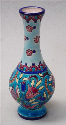 VASE pansu sur piédouche, à col évasé. Décor de fleurs polychromes sur fond à 3 dégradés de bleu.