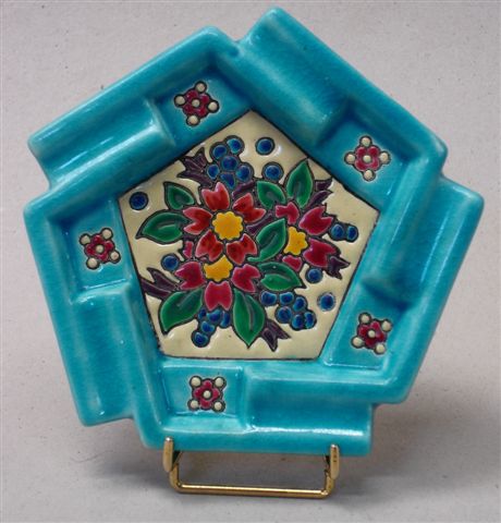 CENDRIER à cinq côtés. Décor d'un bouquet fleuri polychrome en son centre et de fleurettes rouges et jaunes sur les côtés. Fond bleu azur.