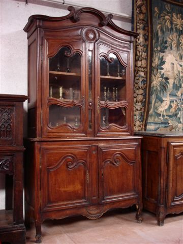 BUFFET deux corps en bois naturel mouluré et sculpté, surmonté d'une corniche cintrée en chapeau de gendarme. La partie supérieure ouvre à deux vantaux (vitrés). Chaque vantail entouré d'une double moulure, est divisé en deux parties inégales par un motif contourné.