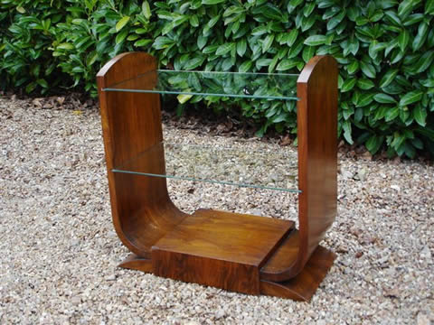 DESSERTE en acajou et placage d'acajou à deux plateaux de verre. Les montants cintrés reposent sur une base rectangulaire.