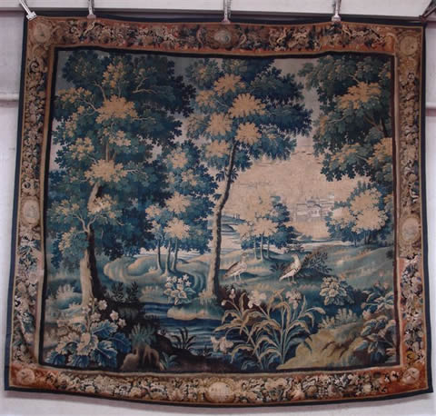 Bordure à décor de guirlandes de fleurs et de fruits argrémentée d'oiseaux, noeuds de rubans, feuilles d'acanthes, et médaillons représentant des vues d'architecture.