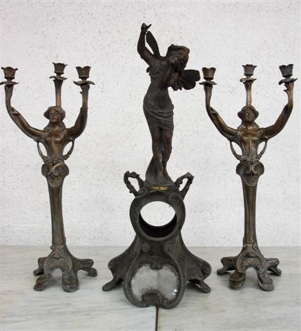 GARNITURE de CHEMINÉE en régule. La pendule, sans son mouvement, prend la forme d'une allégorie de l'Inspiration, femme aux ailes de papillon jouant du violon. Les deux flambeaux à trois bras de lumière, représentent des femmes élancées dont les bras soutiennent les lumières.