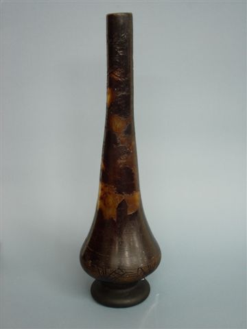 Grand VASE à col allongé en pâte de verre, gravé à l'acide d'une scène de village de montagne. Dans la partie supérieure, les arbres se détachent sur le ciel.
