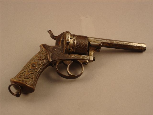 Elle contient un revolver à broche, 6 coups, calibre ?. Canon à pans, barillet et carcasse gravée (manque la baguette). Plaquettes de crosse en bois sculpté.