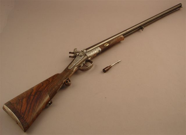 Rare fusil de chasse système Beringer, deux coups, calibre 12-65. Canons juxtaposés de 75,5 cm, damas, datés en dessous « 1858 », ouverture par clé pivotante sous pontet, marqués sur la bande « Invtion Beringer à Paris ». Platines arrières, chiens, bascule, pontet et plaque de couche joliment ciselés de rinceaux feuillagés. Crosse de 36 cm en noyer sculpté de feuilles de chêne et d'écailles.