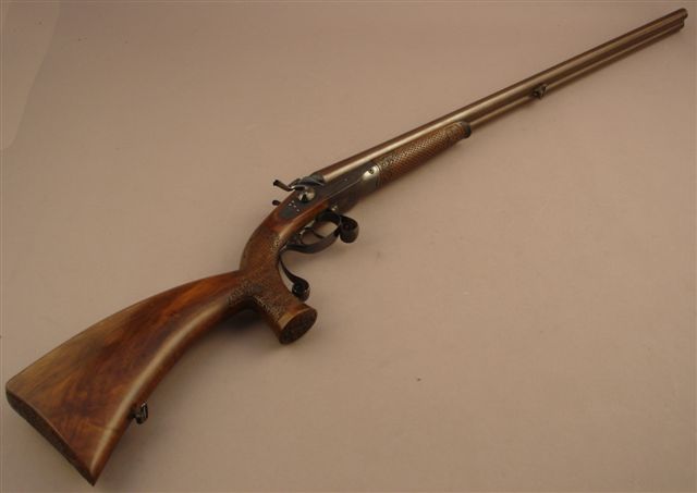 Rare fusil de chasse Lefaucheux à percussion centrale, chiens extérieurs, deux coups, calibre 12-65 extracteur. Canons de Leopold Bernard, juxtaposés, de 75 cm, marqués sur la bande « Mon de l'Inventeur Lefaucheux 37 rue Vivienne Paris ». Platines signées « Lefaucheux Paris ». Ouverture par clé devant pontet. Crosse pistolet de 36,5 cm en partie sculptée d'écailles et de feuilles de chêne.