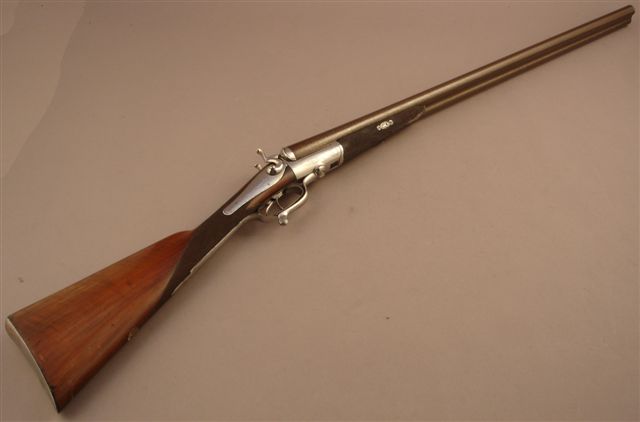 Fusil de chasse à percussion centrale chiens extérieurs, deux coups, calibre 12-65. Canons juxtaposés de 75,8 cm, ruban, damas (piqûres intérieures), signés " Blattie London ". Platines arrières, chiens et bascule gravés de rinceaux. Ouverture par clé sous pontet. Crosse de 35 cm en noyer en partie quadrillé . Fabriqué en 1889. (remis en couleur). 5ème catégorie .