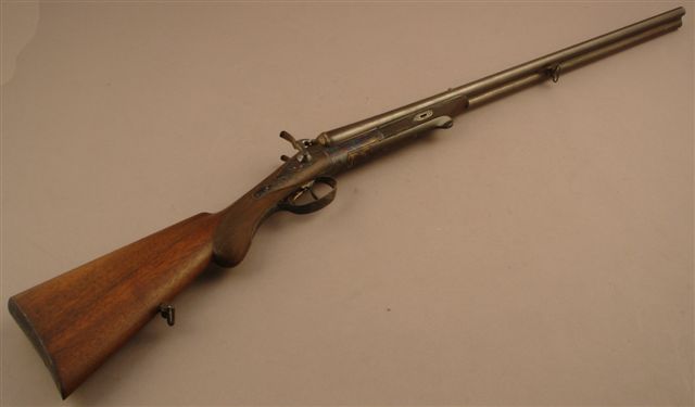 Fusil de chasse mixte à percussion centrale, chiens extérieurs, deux coups, calibre 16 et 11 mm extracteur. Canons juxtaposés de 65 cm, damas, de couleur tabac (piqûres intérieures). Platines arrières, chiens et bascule jaspés. Ouverture par clé en corne sous le devant. Crosse à joue demi-pistolet de 34,5 cm en noyer en partie quadrillé .