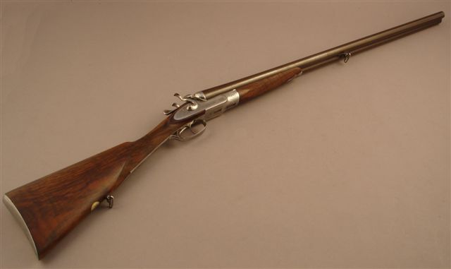 Fusil de chasse à platines à percussion centrale, chiens extérieurs, deux coups, calibre 16-80 extracteur. Canons juxtaposés de 75,6 cm, en damas, de couleur tabac, marqués « GUYOT 12 rue de Ponthieu Paris ». Platines, chiens et bascule gravés. Crosse en noyer de 35 cm en partie quadrillé .