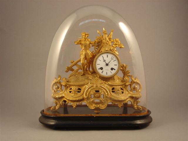 PENDULE en régule doré. Le cadran circulaire orné d'une frise de perles, à chiffres romains est compris dans un fût cannelé. Surmonté de trophées militaires, il est flanqué à gauche d'un soldat claironnant, un verre à la main. L'ensemble repose sur une terrasse supporté par une base chantournée ajourée d'agrafes, de rinceaux et d'entrelacs. Socle de bois noirci. Cloche de verre.