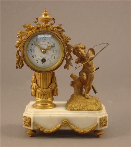 PENDULE en bronze doré et marbre blanc. Le cadran circulaire à chiffres arabes compris dans un cylindre orné d'une frise de perles surmonté d'un pot couvert et d'une chute de laurier, supporté par une colonne cannelée, agrémentée d'une guirlande de laurier. À droite, un Amour reposant sur un tertre décoche une flèche. L'ensemble repose sur un socle de marbre blanc mouluré, à pans coupés, décoré de guirlandes de laurier et de fleurettes de bronze doré. Quatre pieds toupie.