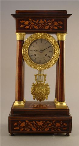 PENDULE PORTIQUE en marqueterie et ornementations de bronze doré. Entablement marqueté de fleur, supporté par quatre colonnes ornées de filets. Chapitaux et socles de bronze doré. Cadran circulaire à chiffres romains entouré d'une frise d'enroulement en bronze doré. Balancier de bronze doré, centré d'un bouquet de fleurs, flanqué d'enroulements et de feuilles d'acanthe.