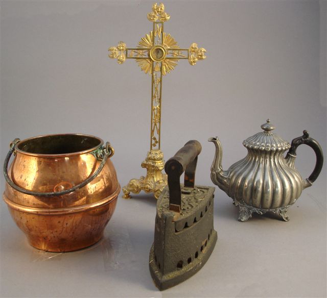 Ensemble d'OBJETS divers : une lampe piètement colonne en bronze, crucifix en bronze, théière godronnée, un fer à repasser ancien, une petite marmite en cuivre, 6 plats en métal.