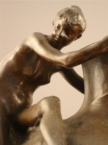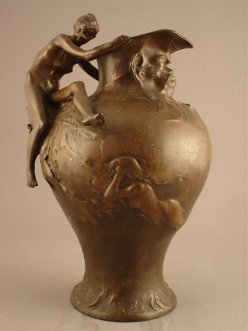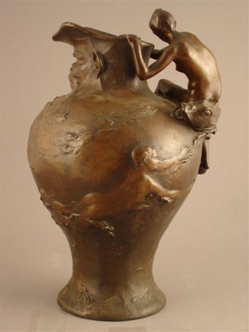 VASE en bronze. Une Naïade, en ronde-bosse appuyée sur un poisson en haut-relief sur l'épaule et se tenant au col sert d'anse. Le visage d'un génie marin, dont la barbe se répand sur la panse orne le col. Un ban de poissons et deux autres Naïades se mêlant aux vagues ornent la panse. La base est ornée de récifs peuplés de crabes et de poulpes. Signé LEDRU à la base, cachet de fondeur Susse frères.