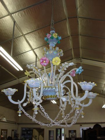 LUSTRE en verre de MURANO, opalescent et de couleurs. Il est à six branches de lumières jaillissant d'une coupe ornée de fleurs et de panaches, recueillant un fut balustre, surmonté de deux boules ornées d'enroulements et de fleurs. Chaînes, pendeloques et feuillages. (quelques accdts et manques).