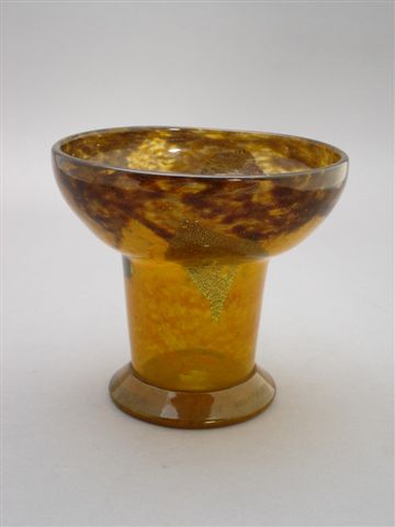 DAUM. COUPE en verre tronconique à bords évasés, en verre brun à poudres et paillons d'or intercalaire éclatés. Signature gravée DAUM NANCY encadrant une croix de Lorraine. Forme moderniste rare.