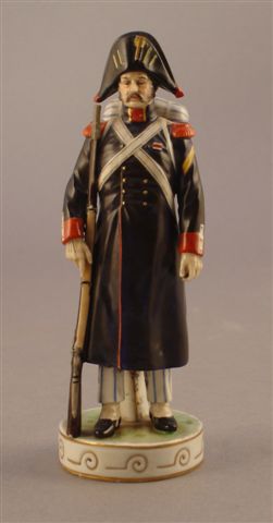 STATUETTE en porcelaine à décor polychrome représentant un soldat de l'armée napoléonienne. Marque en bleu sous couverte sous la base.