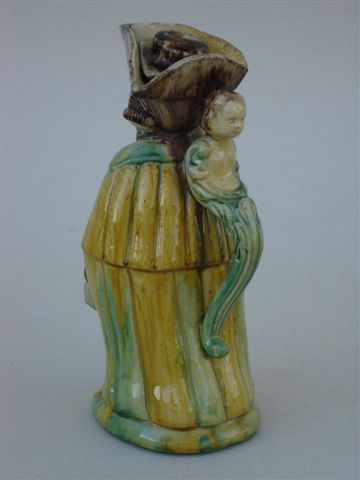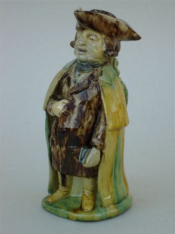 PICHET dit "Jacquot" en terre vernissée vert, jaune, bleu et brun, représentant un homme au tricorne vêtu d'une redingote et d'une cape, portant un livre de la main gauche. Anse en volute feuillagée à la tête d'enfant. Complet de son bouchon.