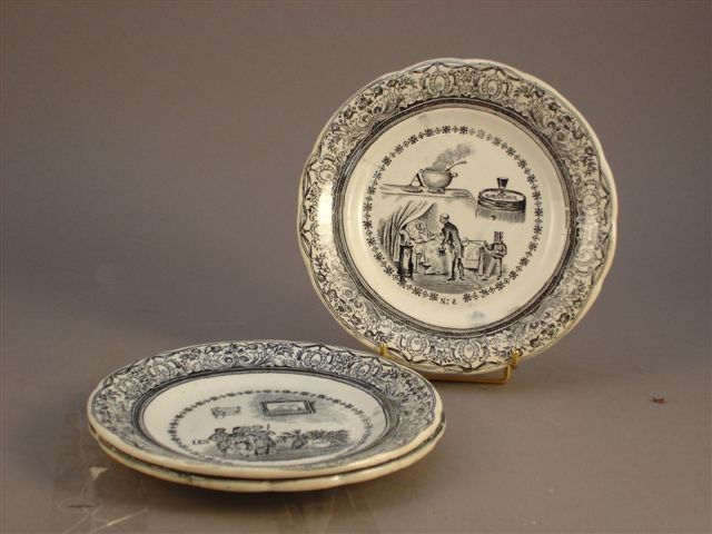 GIEN. Ensemble de trois assiettes en céramique. Deux à décor de rébus (n°8 et 10) et une n° 11, l'histoire de Jeanne d'Arc : « Jeanne prisonnière des Anglais ».