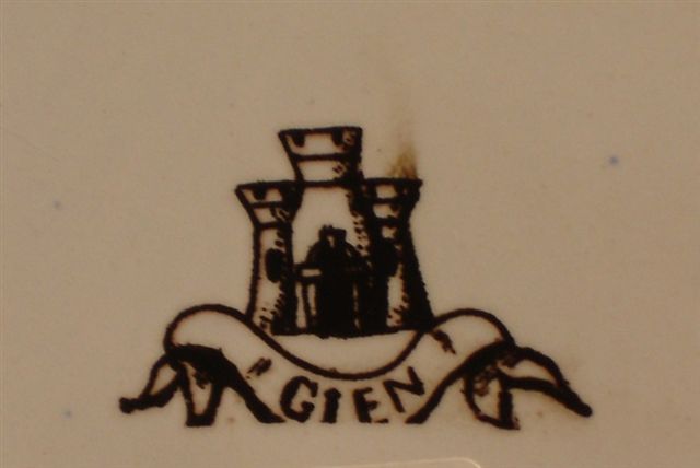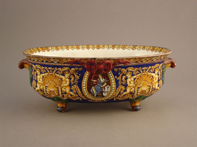 GIEN. Jardinière en céramique de forme ovale. Les flancs centrés de cartouches en fer à cheval figurant le commerce et l'astronomie. Ils sont flanqués de mascarons en camaïeu ocre faisant fontaine sur lesquels s'appuient des putti. Le fond est orné de mascarons affrontés. Prises en enroulements se terminant en feuilles d'acanthe. Pieds cambrés. Porte au revers la marque de GIEN pour 1871.