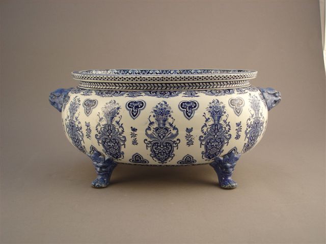 GIEN jardinière en céramique, de forme ovale. Décor en camaïeu bleu de rinceaux, de lambrequins et de pots fleuris. Prises en mufles de chimères dans le goût Chinois. Elle repose sur 4 pieds griffus terminant des mascarons.