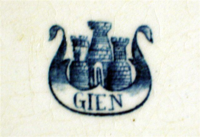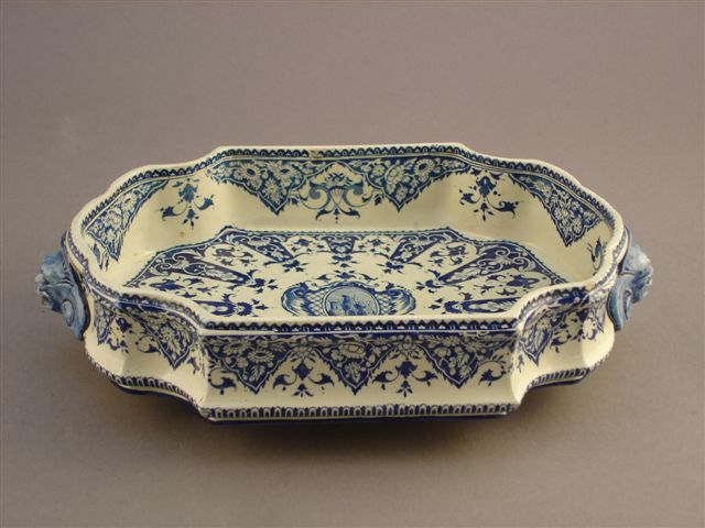 GIEN. Panetière de forme chantournée en céramique à décor rayonnant de lambrequins. Fond centré d'un cartouche contenant la marque de la fabrique. Prises en mufles fantastiques. Pieds pyramidaux. Porte la marque correspondant à l'année 1866.