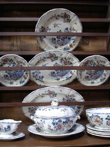 GIEN. SERVICE en faïence à décor floral. Il comprend : 11 assiettes creuses, 33 assiettes plates, 2 ramequins, 1 saucière, 1 soupière, 1 plat rond creux, 1 saladier, 2 plats ovales et un rond. Au total 52 pièces.