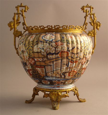 JARRE en porcelaine Imari, panse godronnée; monture de bronze doré dans le goût japonais.