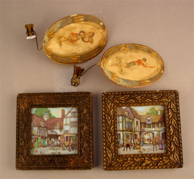 Lot comprenant deux ABAT JOURS pour chandelle en toile et métal, en forme de tambourin. Joint deux plaques de céramique.
