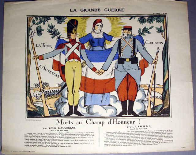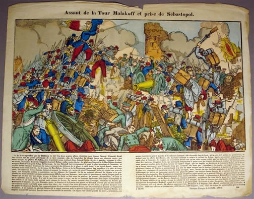 Estampes rehaussées de couleurs. "La Grande Guerre, Morts au Champ d'Honneur" par BENITO, "La Grande Guerre, L'Héroïque Défense de Liège", "Assaut de la Tour de Malakoff et prise de Sébastopol", "Musique de la Garde Nationale Parisienne", "Le Schah de Perse, Nasser-Ed-Din, arrivée du Schah de Perse à Paris."