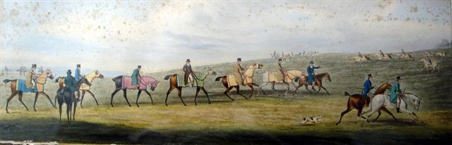 Paire de GRAVURES colorées figurant deux scènes de course.
