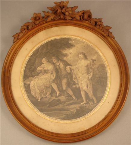 Dans un cadre circulaire, en bois mouluré et surmonté de guirlandes de fleurs, GRAVURE ancienne d'après Angelica KAUFFMAN.