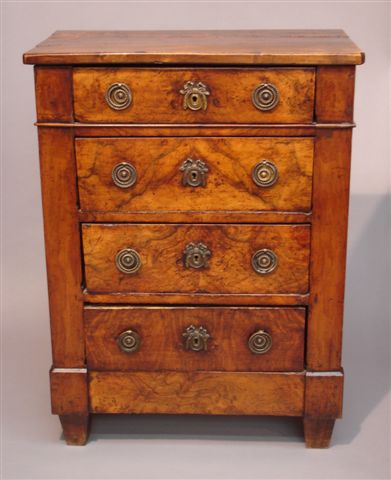 Petit MEUBLE D'ENTRE DEUX de forme rectangulaire en noyer et placage de noyer. Il ouvre à quatre tiroirs sur quatre rangs. Pieds antérieurs en gaine. Plateau bois. Ornements de bronze tels que : entrées de serrures et prises en anneaux.