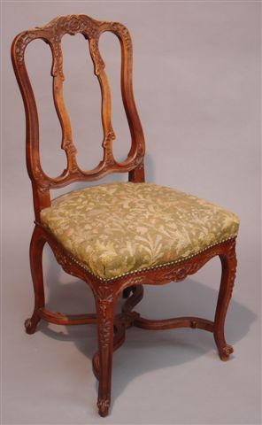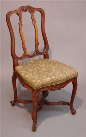 Paire de CHAISES en bois naturel mouluré et sculpté. Dossiers chantournés, ajourés. Pieds cambrés, entretoises en « X ».