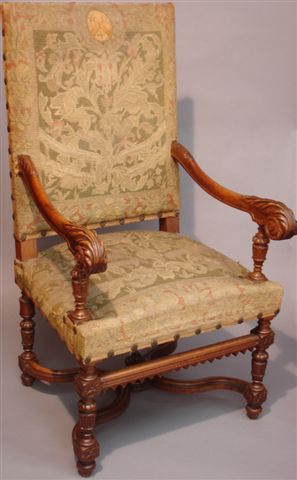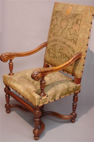 Paire de FAUTEUILS en bois naturel mouluré et sculpté. Assises droites, accotoirs à enroulement sculptés de feuilles d'acanthe, piètement tourné, entretoises en « X ». Garniture de tapisserie.