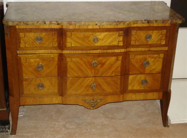 COMMODE de forme rectangulaire en bois de placage. Elle ouvre à trois tiroirs sur trois rangs dont deux sans traverse. Façade à pans coupés ornée de marqueterie en frisage figurant des panneaux feignant des tiroirs. Flancs marquetés en frisage. Pieds cambrés. Ornementation de bronze tels que : tablier, entrées de serrure, prises, triglyphes sur les montant, chaussons. Dessus de marbre brèche d'Alep.