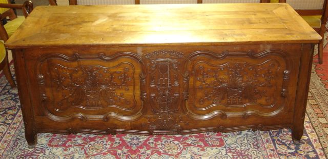COFFRE transformé en BUREAU de forme rectangulaire en noyer mouluré et sculpté. Il ouvre à quatre tiroirs dans la ceinture et deux vantaux latéraux dégageant un espace central. Belle façade d'un large panneau sculpté de deux cartouches chantournés centrés de bouquets fleuris. Tirettes latérales. Pieds cambrés.