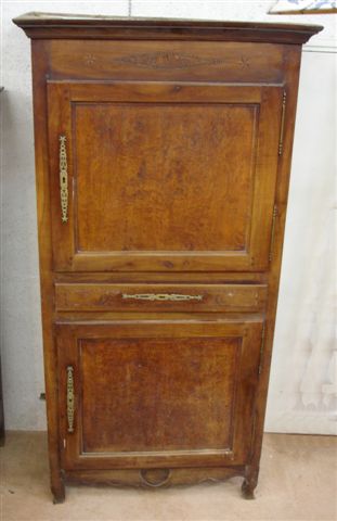 CABINET NANTAIS de forme rectangulaire, en bois naturel mouluré et en marqueterie. Il ouvre à deux vantaux séparés par un tiroir. Fronton orné d'un losange marqueté flanqué de deux étoiles de marqueterie.