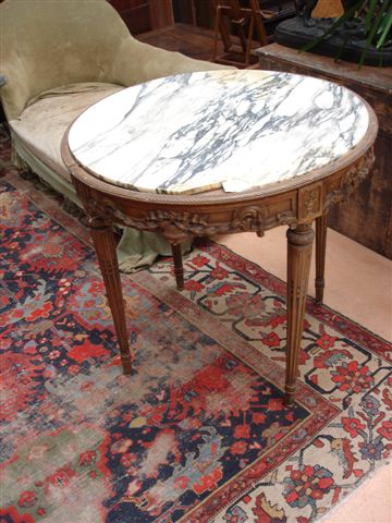 TABLE de forme RONDE en bois naturel mouluré et sculpté. Ceinture sculptée de rinceaux et guirlandes de laurier. Pieds fuselés, cannelés et rudentés. Dessus de marbre blanc veiné.