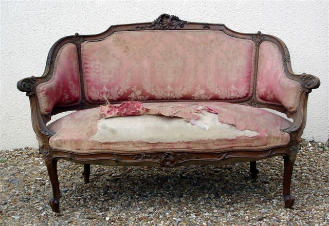 CANAPÉ de forme corbeille en bois naturel mouluré et sculpté. Dossier sommé d'une coquille. Pieds cambrés.