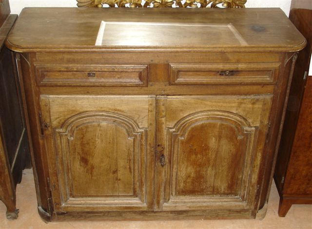 BUFFET de forme rectangulaire en bois naturel mouluré. Il ouvre à deux tiroirs et deux vantaux. Les pans arrondis, il repose sur une plinthe.