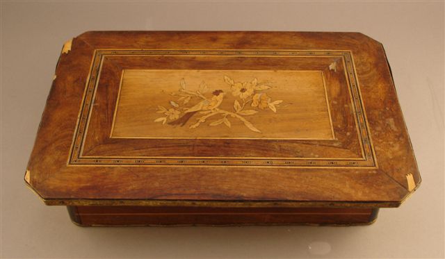 COFFRET en marqueterie. Plateau marqueté d'un oiseau sur une branche fleurie, garni au revers d'un miroir, il découvre trois compartiments.